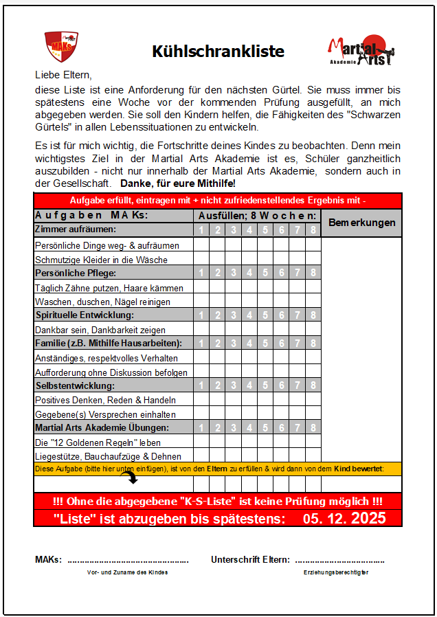 Liebe Eltern, liebe MAKs, um zu einer Gürtelprüfung zugelassen zu werden, ist es notwendig, dass diese beiden Listen vor der Prüfung abgegeben werden.